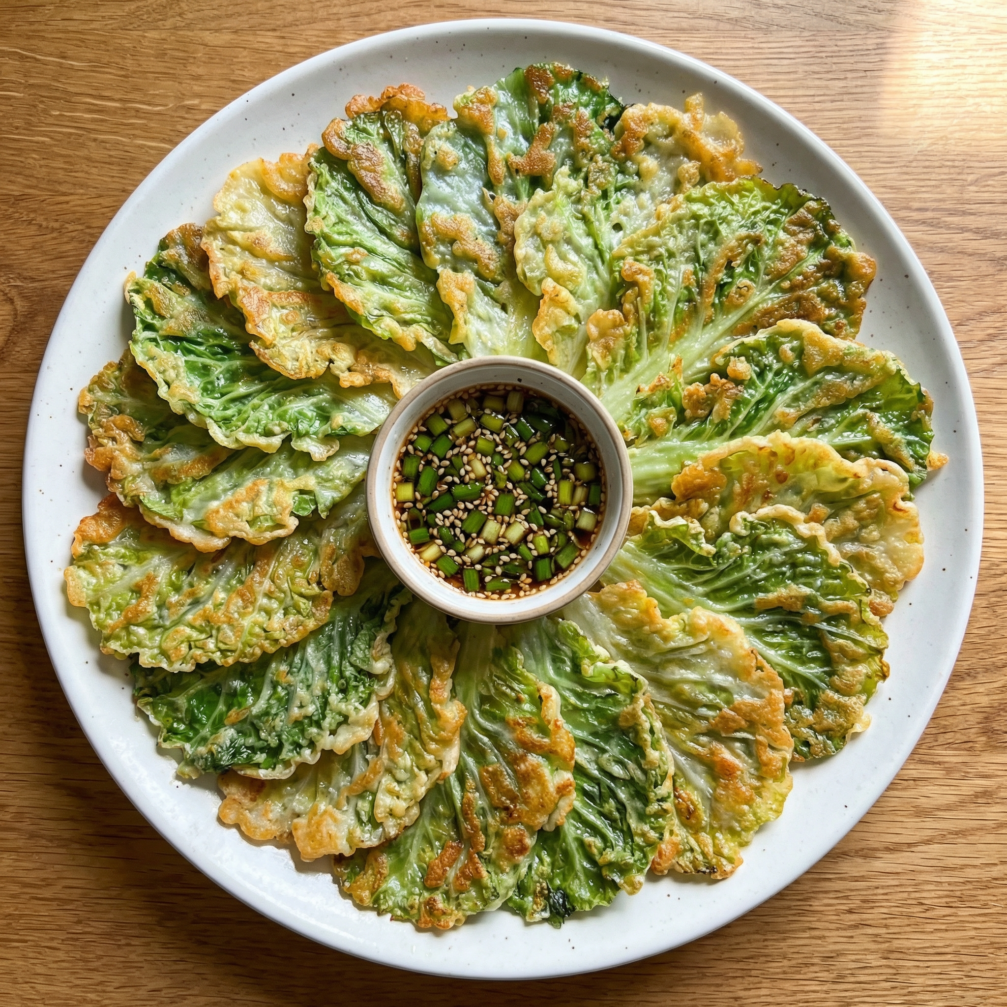 물기를 제거한 봄동잎을 반죽물에 담궈 양쪽으로 충분히 묻힌 후 식용유에 부쳐내면 된답니다.